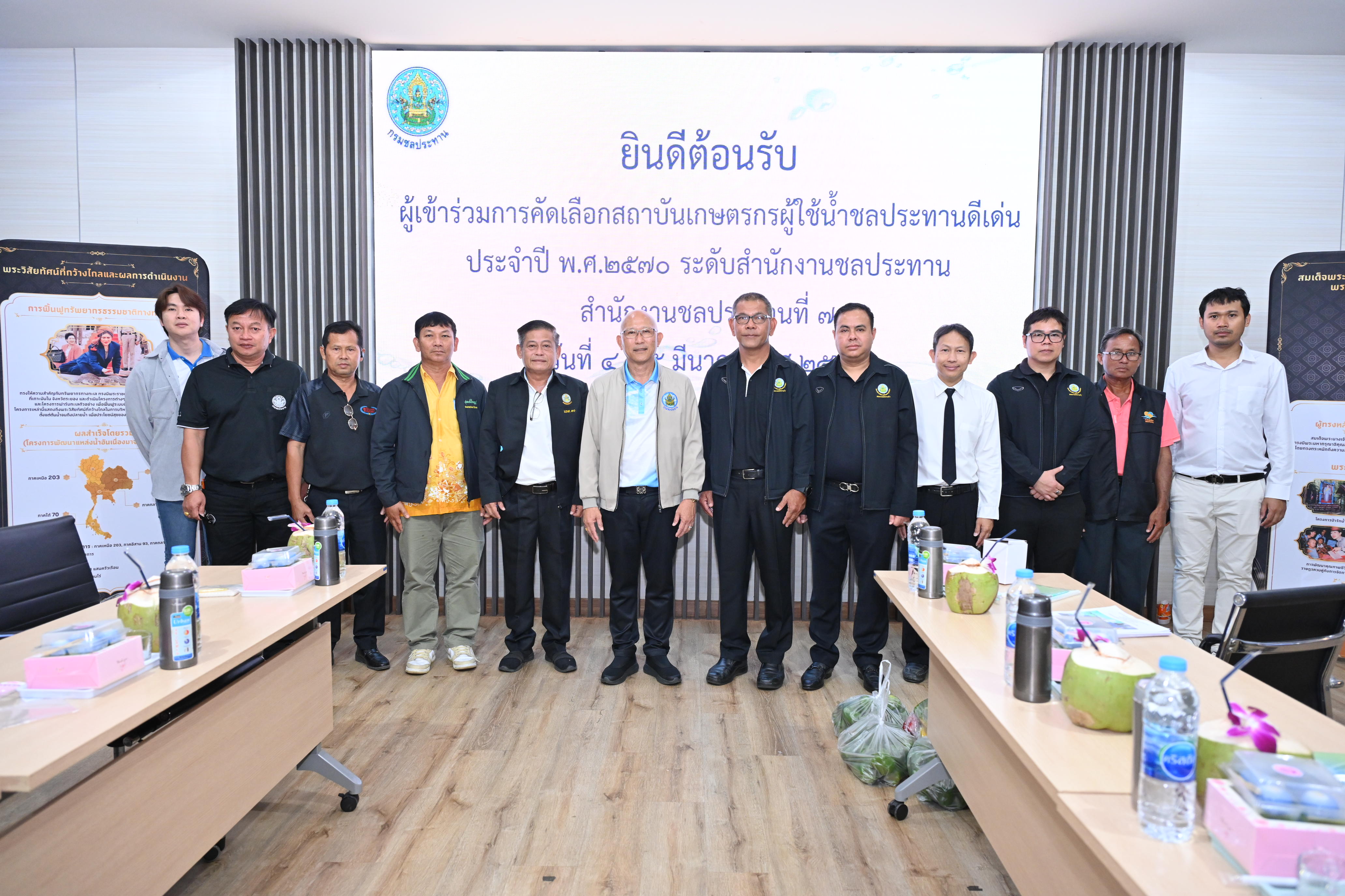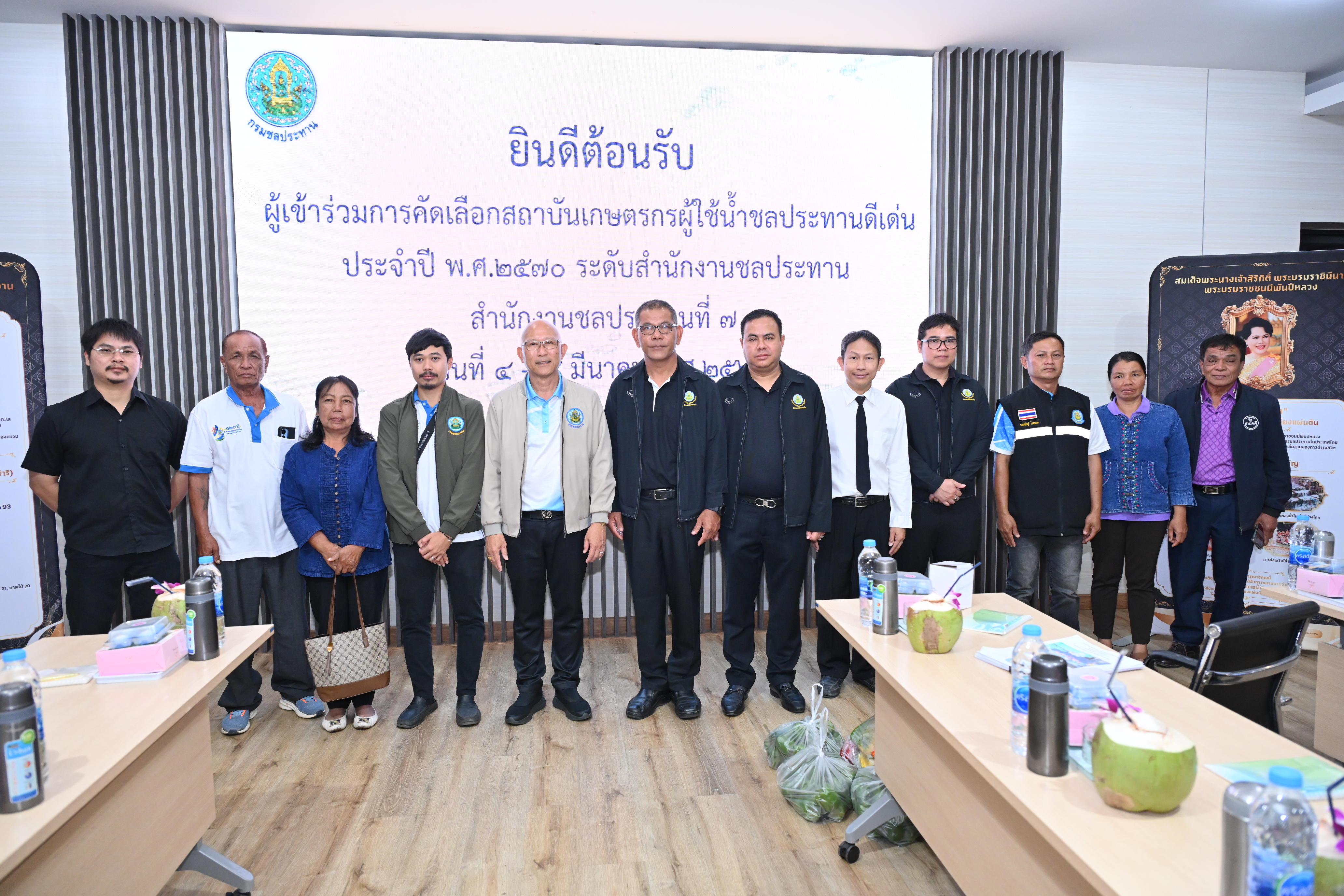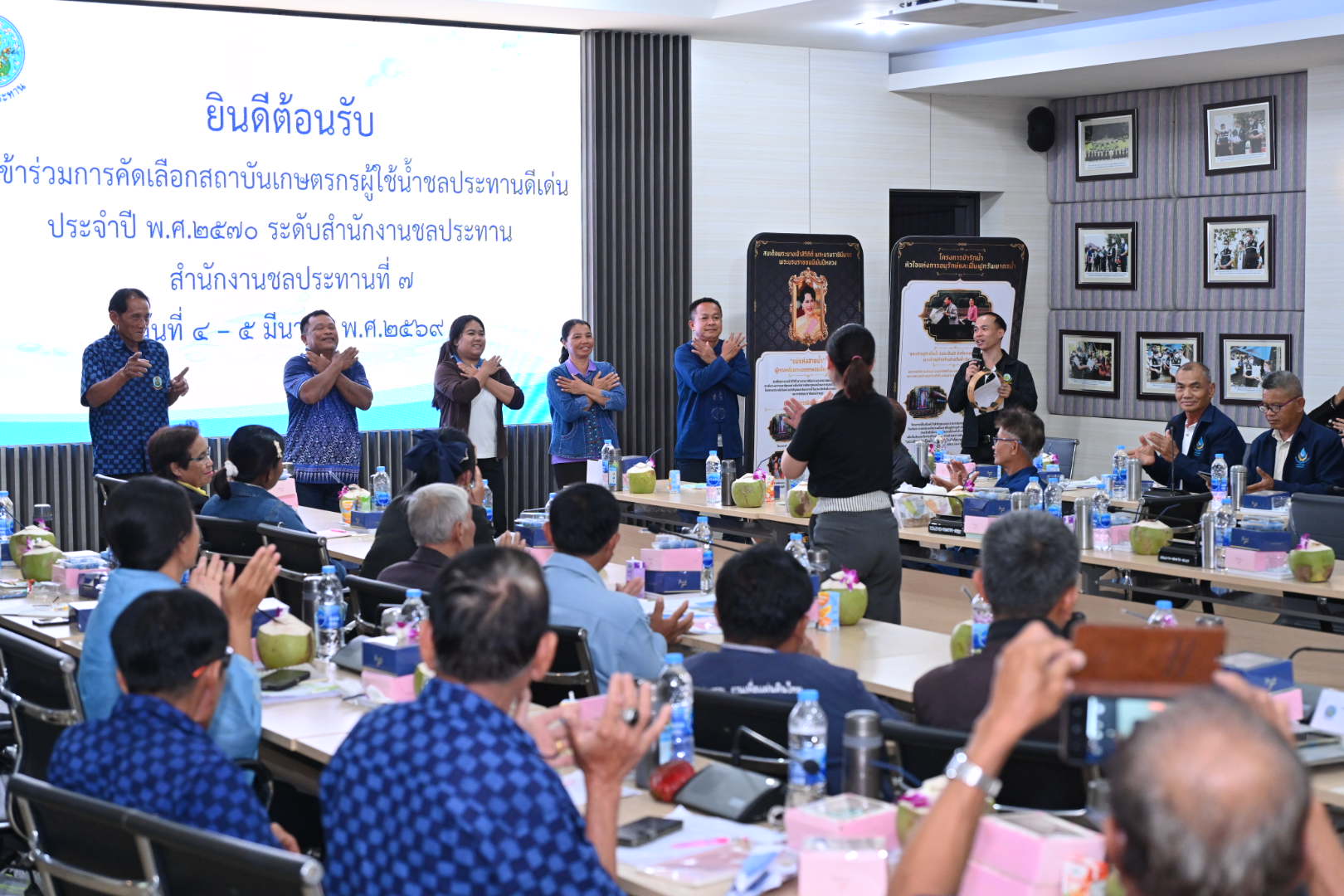 วันพุธที่ 4 มีนาคม 2569 สำนักงานชลประทานที่ 7 ดำเนินการคัดเลือกสถาบันเกษตรกรผู้ใช้น้ำชลประทานดีเด่น ประจำปี 2570 โดย นายปริญญา คัชมาตย์ ผู้อำนวยการสำนักงานชลประทานที่ 7 มอบหมายให้ นายเศรษฐพงศ์ ภิงคารวัฒน์ รองผู้อำนวยการสำนักงานชลประทานที่ 7 พร้อมด้วย ผู้อำนวยการส่วน หัวหน้าฝ่าย และเจ้าหน้าที่ผู้เกี่ยวข้อง ดำเนินการประเมินคัดเลือกสถาบันเกษตรกรผู้ใช้น้ำชลประทานดีเด่น เพื่อเป็นตัวแทน ระดับสำนักงานชลประทาน 7 ประจำปี 2570 ซึ่งจัดขึ้นในระหว่างวันที่ 4 - 5 มีนาคม 2569 โดยก่อนเริ่มประเมินฯ ได้มีกิจกรรมกลุ่มสัมพันธ์ เพื่อสร้างความคุ้นเคยให้กับสถาบันเกษตรกรผู้ใช้น้ำดีเด่น ในการนี้ ได้มีกำหนดการนำเสนอโดยกลุ่มบริหารการใช้น้ำฯ ดังนี้