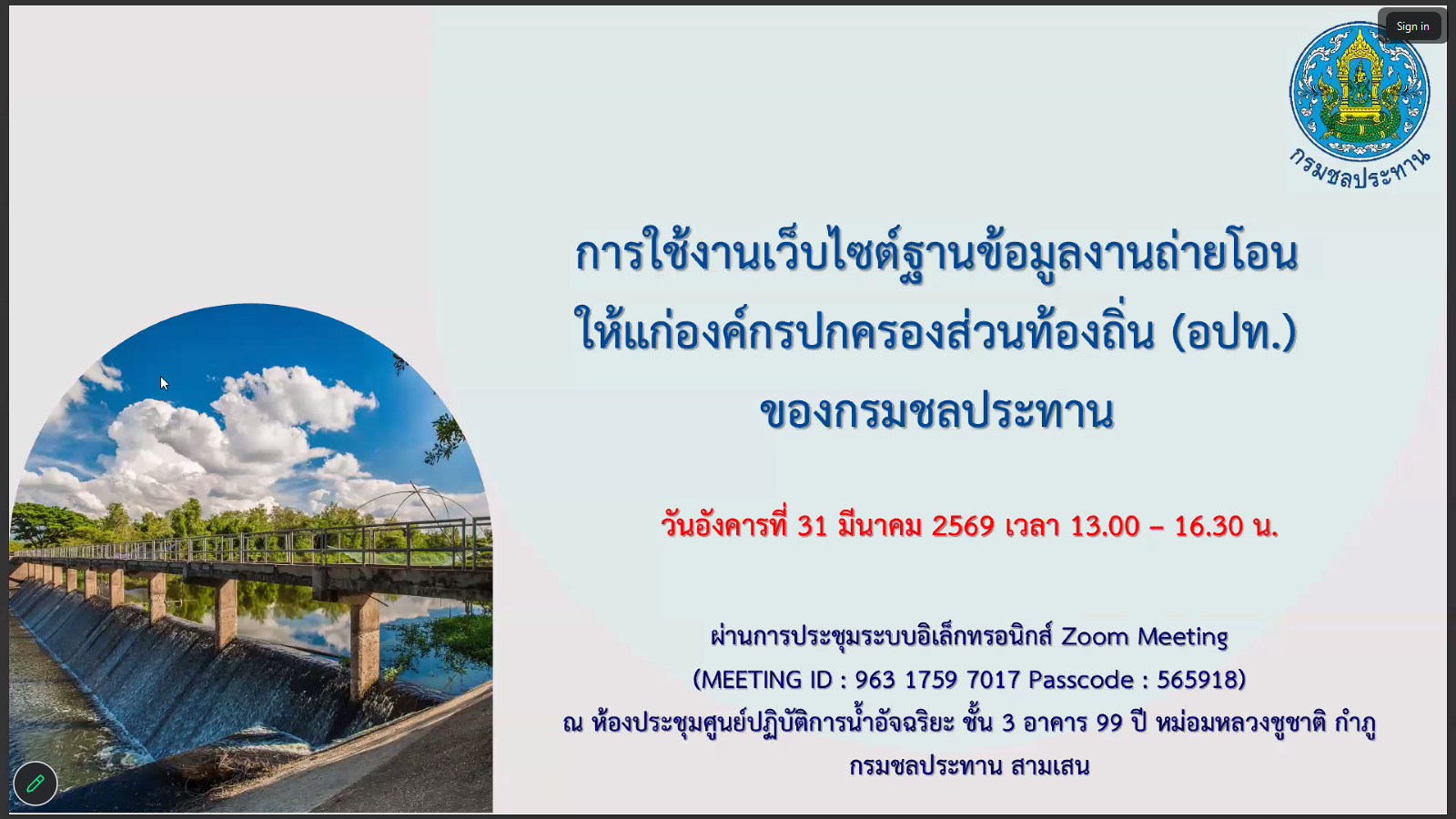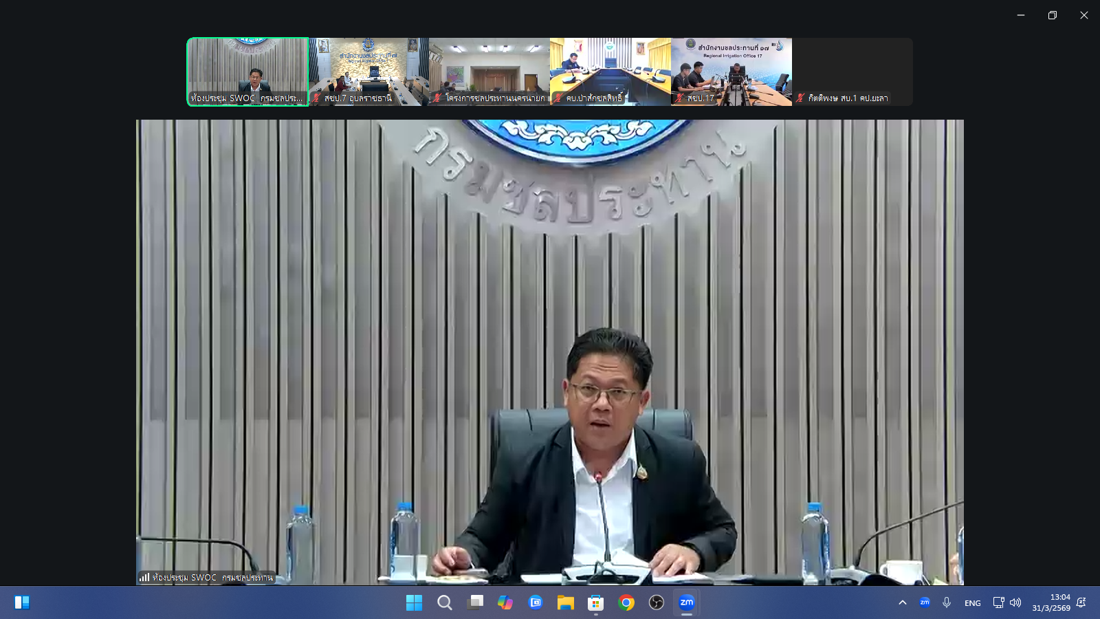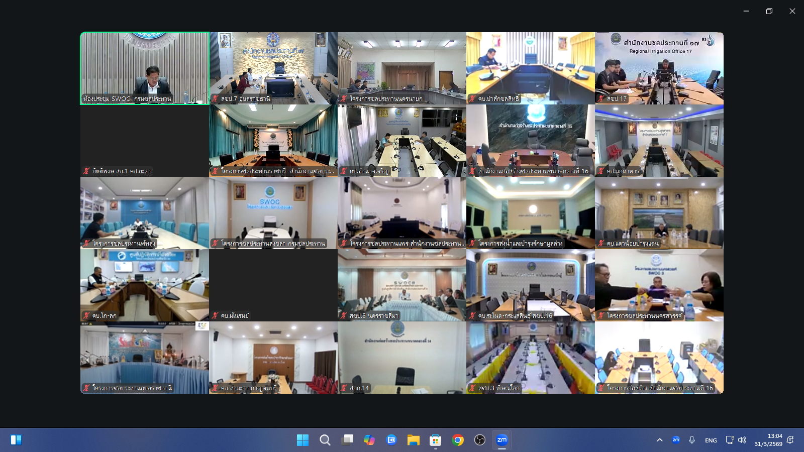 วันอังคารที่ 31 มีนาคม 2569 เวลา 13.00 น. สำนักงานชลประทานที่ 7 นำโดย นายปริญญา คัชมาตย์ ผู้อำนวยการสำนักงานชลประทานที่ 7 พร้อมด้วย นายเศรษฐพงศ์ ภิงคารวัฒน์ รองผู้อำนวยการสำนักงานชลประทานที่ 7 ผู้อำนวยการส่วน หัวหน้าฝ่าย และเจ้าหน้าที่ผู้เกี่ยวข้อง เข้าร่วมประชุมการใช้งานเว็บไซต์ฐานข้อมูลงานถ่ายโอนภารกิจให้แก่องค์กรปกครองส่วนท้องถิ่น (อปท.) ของกรมชลประทาน ผ่านระบบ Zoom Meeting จากห้องประชุมศูนย์ปฏิบัติการน้ำอัจฉริยะ ชั้น 3 อาคาร 99 ปี หม่อมหลวงชูชาติ กำภู กรมชลประทาน สามเสน กรุงเทพฯ โดยมี ดร.ธเนศร์ สมบูรณ์ ผู้อำนวยการสำนักบริหารจัดการน้ำและอุทกวิทยา เป็นประธานการประชุมฯ เพื่อร่วมรับฟังและแลกเปลี่ยนความคิดเห็น เกี่ยวกับการชี้แจงภาพรวมการถ่ายโอนภารกิจให้แก่องค์กรปกครองส่วนท้องถิ่น (อปท.) ของกรมชลประทาน และการแนะนำเว็บไซต์ฐานข้อมูลงานถ่ายโอนภารกิจฯ รวมถึงการสาธิตและฝึกปฏิบัติการใช้งานเว็บไซต์ให้เป็นไปอย่างมีประสิทธิภาพต่อไป ณ ห้องประชุมอาคารศูนย์ปฏิบัติการน้ำอัจฉริยะ สำนักงานชลประทานที่ 7 (SWOC 7) อำเภอเมือง จังหวัดอุบลราชธานี
