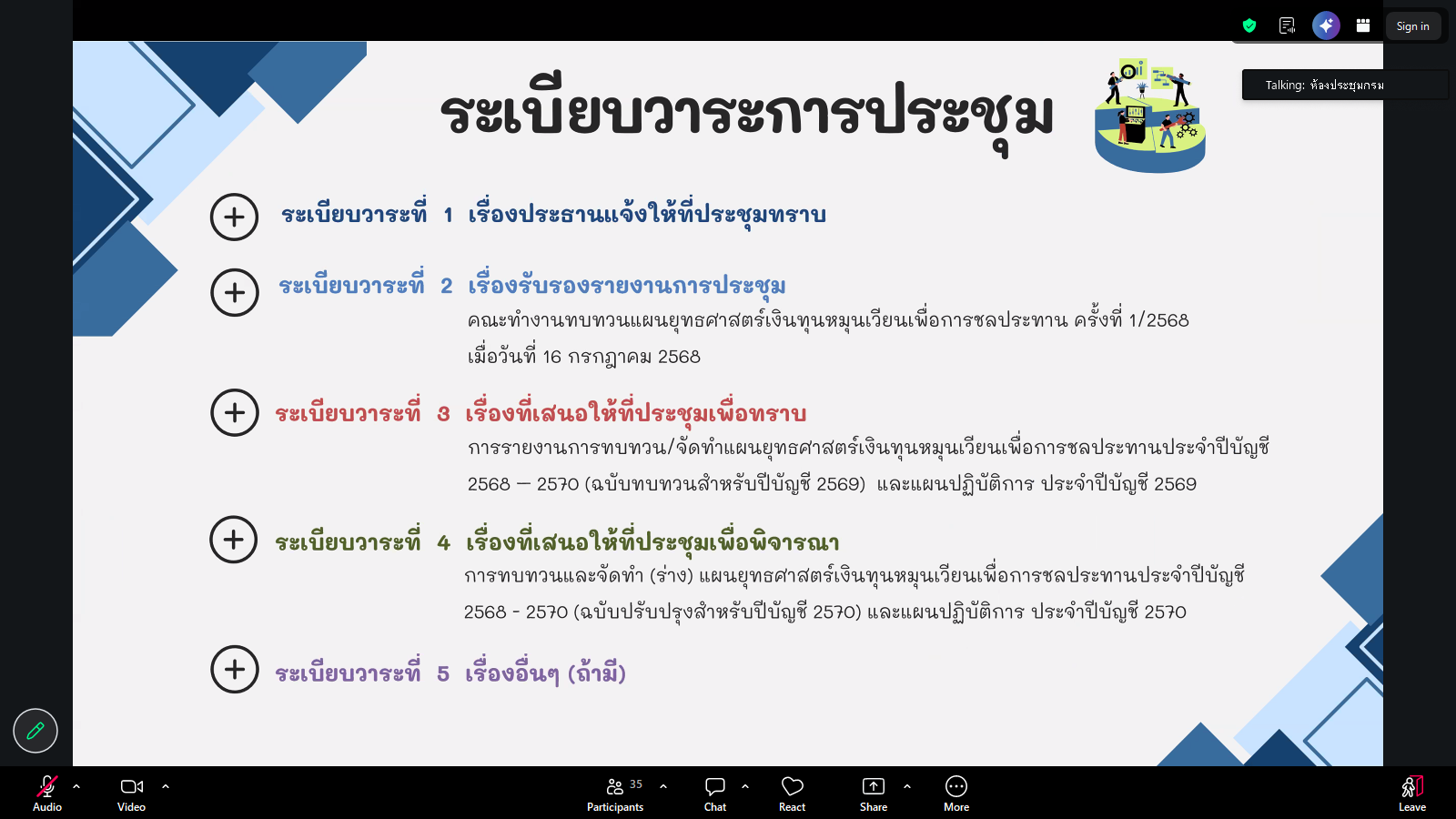 วันพฤหัสบดีที่ 16 เมษายน 2569 เวลา 13.30 น. สำนักงานชลประทานที่ 7 โดย นายปริญญา คัชมาตย์ ผู้อำนวยการสำนักงานชลประทานที่ 7 มอบหมายให้ นายเศรษฐพงศ์ ภิงคารวัฒน์ รองผู้อำนวยการสำนักงานชลประทานที่ 7 พร้อมด้วย นายจักรฤทธิ์ ตรีนาจ ผู้อำนวยการส่วนแผนงาน นายปัณณวิชญ์ เฟืองทอง หัวหน้าฝ่ายโครงการพิเศษ และเจ้าหน้าที่ผู้เกี่ยวข้อง เข้าร่วมประชุมคณะทำงานทบทวนแผนยุทธศาสตร์เงินทุนหมุนเวียนเพื่อการชลประทานครั้งที่ 1/2569 ผ่านระบบ Zoom Meeting จากห้องประชุมกรมชลประทาน ชั้น 3 อาคารอำนวยการ กรมชลประทาน สามเสน กรุงเทพฯ โดยมี นายทรงพล สวยสม รองอธิบดีฝ่ายบริหาร เป็นประธานการประชุมฯ เพื่อรับทราบการรายงานการทบทวน/จัดทำแผนยุทธศาสตร์เงินทุนหมุนเวียนเพื่อการชลประทาน ประจำปีบัญชี 2568 - 2570 (ฉบับทบทวนสำหรับปีบัญชี 2569) และแผนปฏิบัติการ ประจำปีบัญชี 2569 รวมทั้งพิจารณาการทบทวนและจัดทำ (ร่าง) แผนยุทธศาสตร์เงินทุนหมุนเวียนเพื่อการชลประทาน ประจำปี 2568 - 2570 (ฉบับปรับปรุงสำหรับปีบัญชี 2570) และแผนปฏิบัติการ ประจำปี 2570 ให้เป็นไปด้วยความเรียบร้อย ถูกต้อง ตามหลักเกณฑ์ที่กรมกำหนดไว้ต่อไป ณ ห้องประชุมเล็ก อาคารศูนย์ปฏิบัติการน้ำอัจฉริยะ สำนักงานชลประทานที่ 7 (SWOC 7) อำเภอเมือง จังหวัดอุบลราชธานี